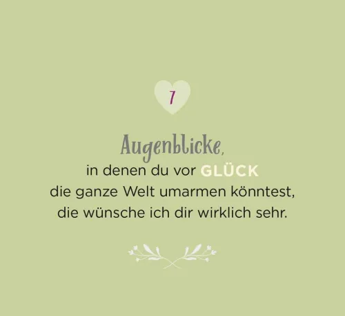 Glück, Gesundheit, Mut, Zuversicht, Spaß und Heiterkeit – all das wünscht man seinen Liebsten. Eine Gelegenheit, um jemandem seine guten Wünsche mit auf den Weg zu geben, ergibt sich immer: ob zum Geburtstag, um Danke zu sagen, als Mutspender, wenn jemand krank ist, für eine Prüfung oder einen Umzug, ob zwischendurch für die beste Freundin, die Lieblingskollegin oder für die Familie. Die Wünsche in diesem Aufsteller passen zu vielen Lebenssituationen. 100 persönlich formulierte Texte werden ergänzt durch weitere inspirierende Zitate und Sprichwörter.