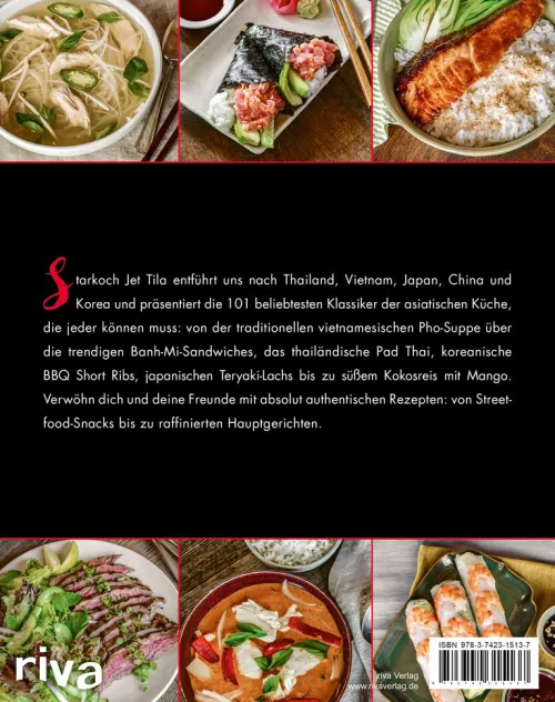 Starkoch Jet Tila entführt uns nach Thailand, Vietnam, Japan, China und Korea und präsentiert die 101 beliebtesten Klassiker der asiatischen Küche, die jeder können muss: von der traditionellen vietnamesischen Pho-Suppe über die trendigen Banh-Mi-Sandwiches, das thailändische Pad Thai, koreanische BBQ Short Ribs, japanischen Teryaki-Lachs bis zu süßem Kokosreis mit Mango. Verwöhn dich und deine Freunde mit absolut authentischen Rezepten: von Streetfood-Snacks bis zu raffinierten Hauptgerichten.
