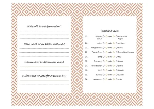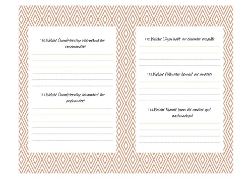 Deine beste Freundin ist einer der wichtigsten Menschen in deinem Leben. Ihr erzählt euch nicht nur alles und kennt all eure Geheimnisse, ihr ertragt auch eure Macken und teilt den gleichen Humor. Das gemeinsame Ausfüllen der 999 lustigen, ernsten, verrückten und interessanten Fragen macht nicht nur viel Spaß, ihr entdeckt auch ganz neue Seiten an der anderen und an eurer Freundschaft. Die mal einzeln, mal zusammen auszufüllenden Fragen beschäftigen sich mit euren persönlichen Vorlieben, gemeinsamen Erinnerungen, Herzenswünschen, Gemeinsamkeiten, Unterschieden und damit, was eure Freundschaft so einzigartig und besonders macht. Ausgefüllt wird das Buch so zu einem ganz besonderen Erinnerungsstück.