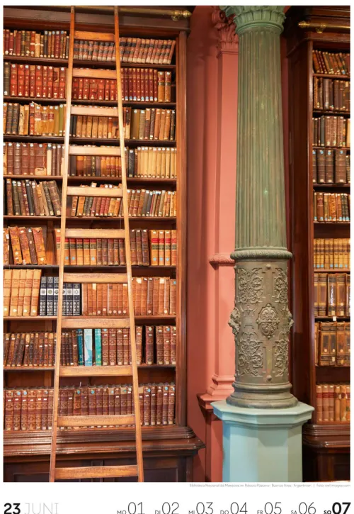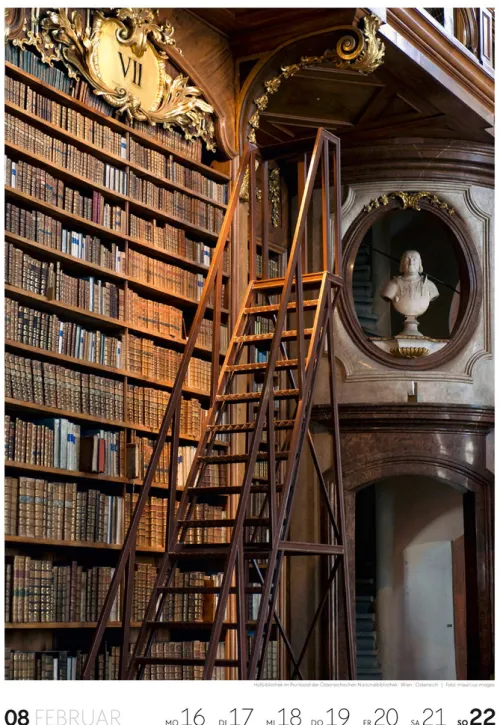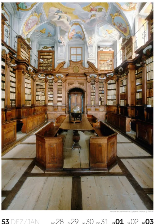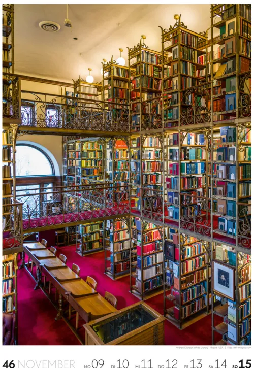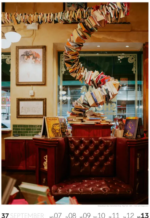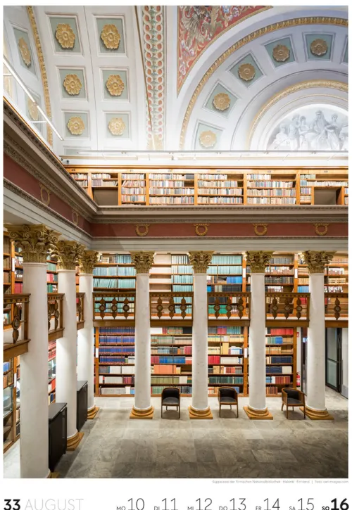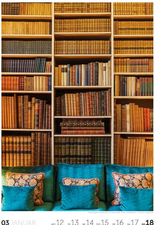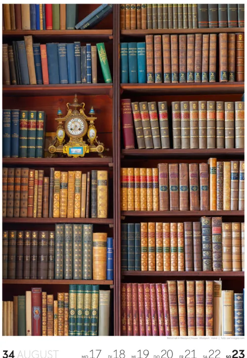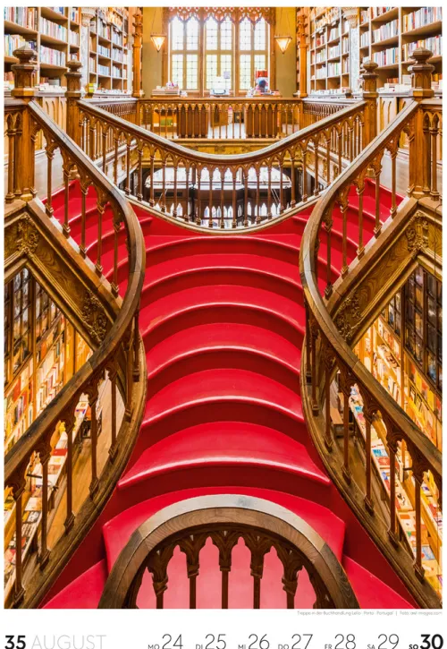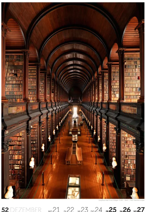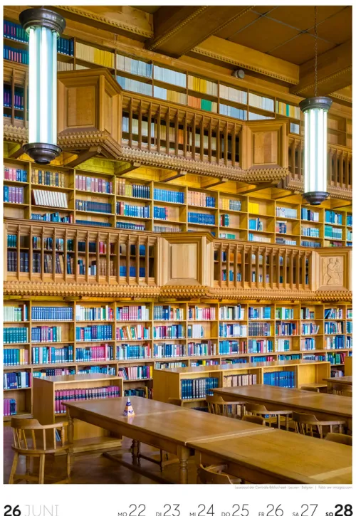 Für Buchfans und Leseratten: Dieser Wochenkalender setzt die Magie des Lesens eindrucksvoll in Szene – mal prunkvoll, mal modern, mal gemütlich oder schlicht beeindruckend. Die klare Bildkomposition fängt die Ästhetik von Lesesälen, Bibliotheken und Buchhandlungen auf einzigartige Weise ein und strahlt dabei stets die Liebe zu Wort, Buch und Wissen aus. Jede Kalenderwoche erzählt eine neue Geschichte rund um die Welt der Bücher. Ideal für alle, die sich von der Schönheit der Bücher inspirieren lassen möchten.