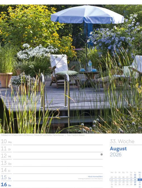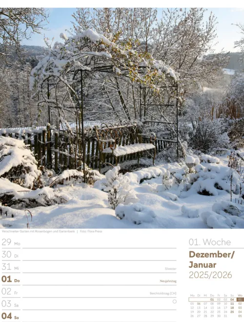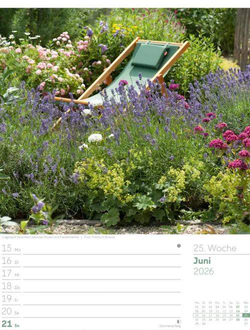 „Einer der schönsten Wege zu uns selbst führt durch einen Garten.“ Wenn Sie dieser Aussage zustimmen und selbst Ruhe und Ausgeglichenheit beim Blick auf Grünes und Blühendes finden, wird Ihnen dieser Wochenkalender tagtäglich Freude bereiten. Blumen- und Gartenspezialist:innen wie Friedrich Strauß, Marianne Majerus oder Flora Press halten die herrlichsten Gartenparadiese im Bild fest und haben dabei auch die Details im Blick. Übersichtliches Kalendarium mit Platz für Ihre Einträge und dazu jede Woche neuer Rätselspaß: Kreuzworträtsel und Sudokus auf allen Rückseiten.