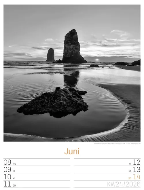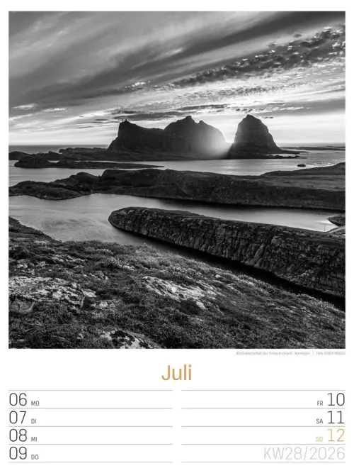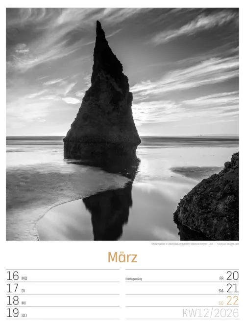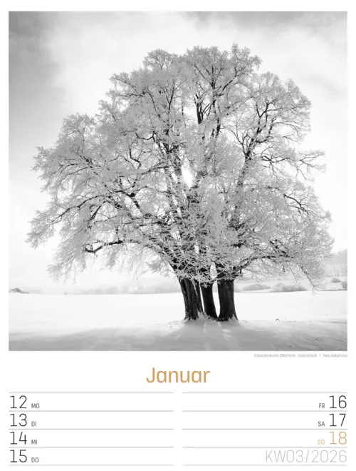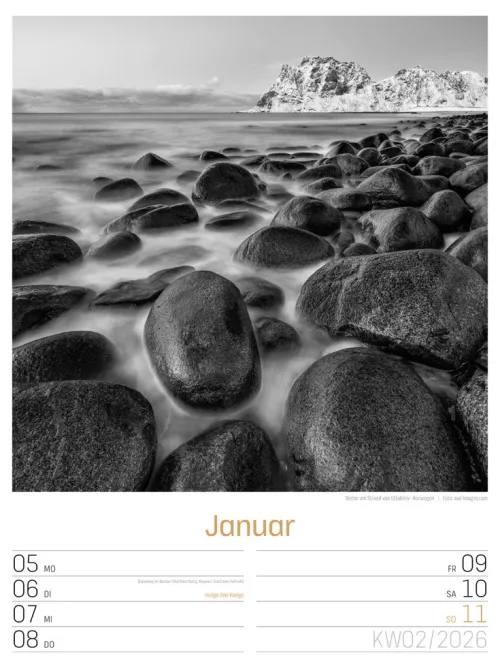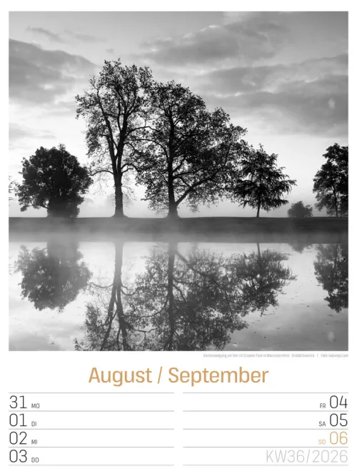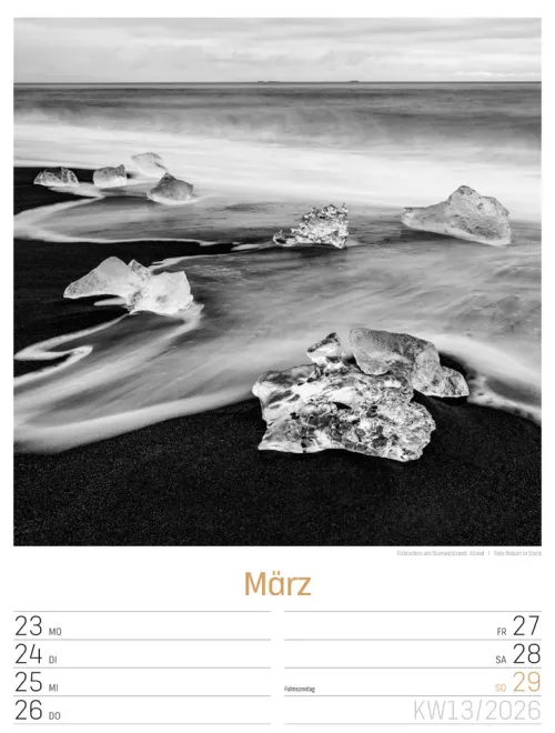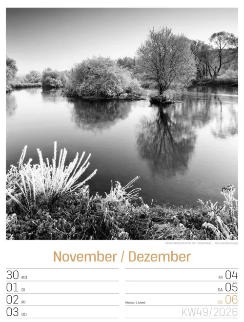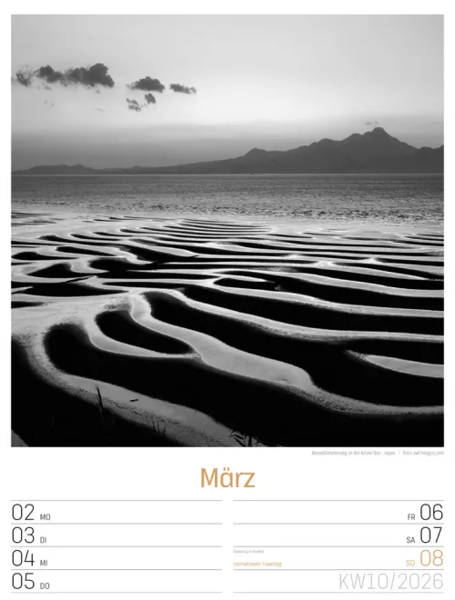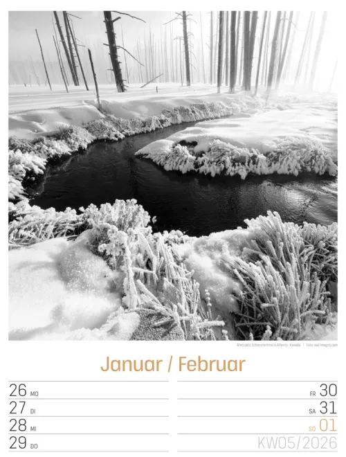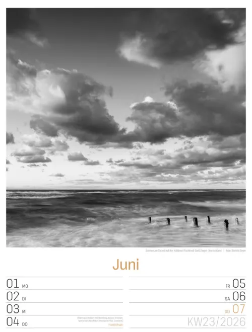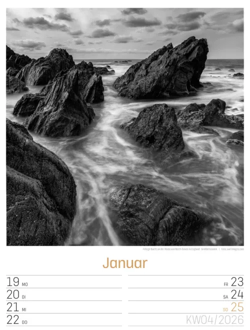 - Wochenkalender mit 53 reduzierten Schwarz-Weiß-Aufnahmen von Landschaft und Natur