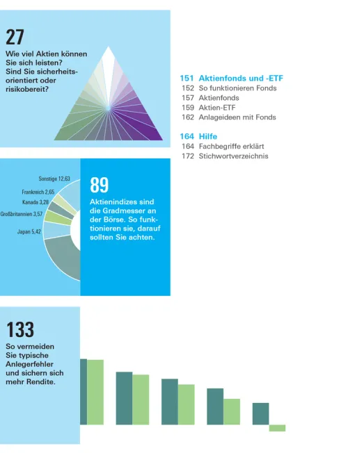 Auch ETF und Fonds werden ausführlich erklärt – von der Funktionsweise über Sparpläne bis zu konkreten Anlageideen. Ergänzt wird das Praxisbuch durch verständliche Erklärungen zu Indizes, Börsenhandel, Finanzwissen und langfristiger Vorsorge bis zum Ruhestand.