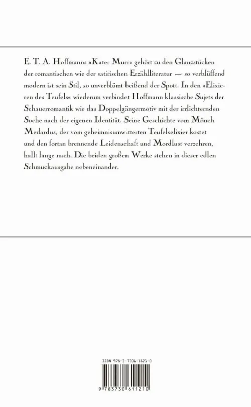 E. T. A. Hoffmanns »Kater Murr« gehört zu den Glanzstücken der romantischen wie der satirischen Erzählliteratur – so verblüffend modern ist sein Stil, so unverblümt beißend der Spott. In den »Elixieren des Teufels« wiederum verbindet Hoffmann klassische Sujets der Schauerromantik wie das Doppelgängermotiv mit der irrlichternden Suche nach der eigenen Identität. Seine Geschichte vom Mönch Medardus, der vom geheimnisumwitterten Teufelselixier kostet und den fortan brennende Leidenschaft und Mordlust verzehren, hallt lange nach. Die beiden großen Werke stehen in dieser edlen Schmuckausgabe nebeneinander.