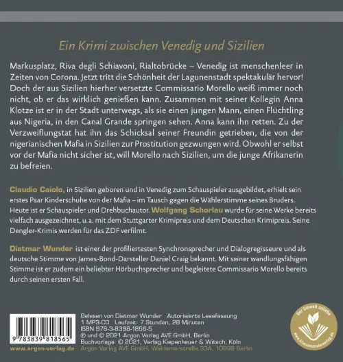 Markusplatz, Riva degli Schiavoni, Rialtobrücke Venedig ist menschenleer in Zeiten von Corona. Jetzt tritt die Schönheit der Lagunenstadt spektakulär hervor. Doch der aus Sizilien hierher versetzte Commissario Morello weiß immer noch nicht, ob er das wirklich genießen kann. Zusammen mit seiner Kollegin Anna Klotze ist er in der Stadt unterwegs, als sie einen jungen Mann, einen Flüchtling aus Nigeria, in den Canal Grande springen sehen. Anna kann ihn retten. Zu der Verzweiflungstat hat ihn das Schicksal seiner Freundin gebracht, die von der nigerianischen Mafia in Sizilien zur Prostitution gezwungen wird. Obwohl er selbst vor der Mafia nicht sicher ist, will Morello nach Sizilien, um die junge Afrikanerin zu befreien. Anna Klotze schließt sich ihm trotz seiner Bedenken an. Sie fahren aus Sicherheitsgründen mit einem Segelboot los . . .