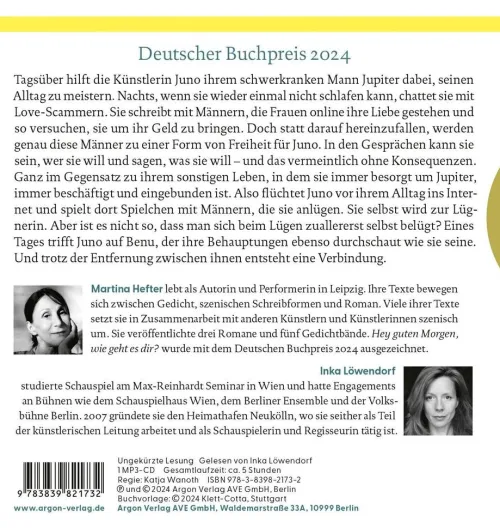 Tagsüber hilft Juno ihrem schwerkranken Mann Jupiter dabei, seinen Alltag zu meistern. Außerdem ist sie Künstlerin, tanzt und spielt Theater. Und nachts, wenn sie wieder einmal nicht schlafen kann, chattet sie mit Love-Scammern im Internet.