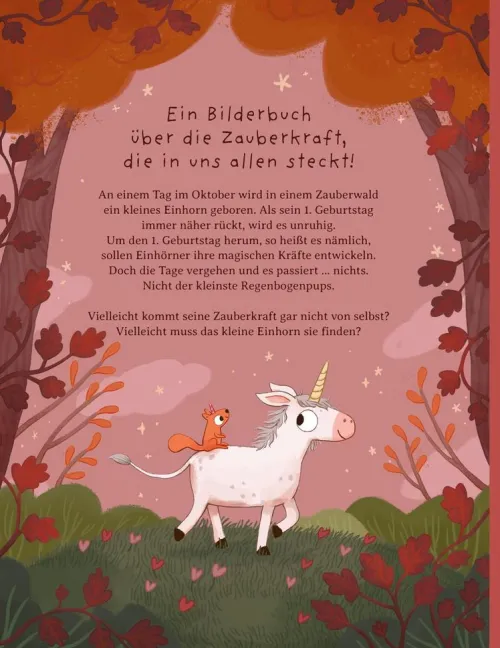 An einem goldenen Oktobertag wird ein kleines Einhorn geboren. Kurz vor seinem 1. Geburtstag wartet es gespannt darauf, seine magischen Kräfte zu entdecken – doch es passiert . . . nichts. Es macht sich auf die Suche und erkennt mit Hilfe eines frechen Einhörnchens, dass es die größte Zauberkraft längst in sich trägt: Seine Freundlichkeit! Eine magische Geschichte, die Kinder stärkt und zeigt: Jeder trägt etwas Besonderes in sich.