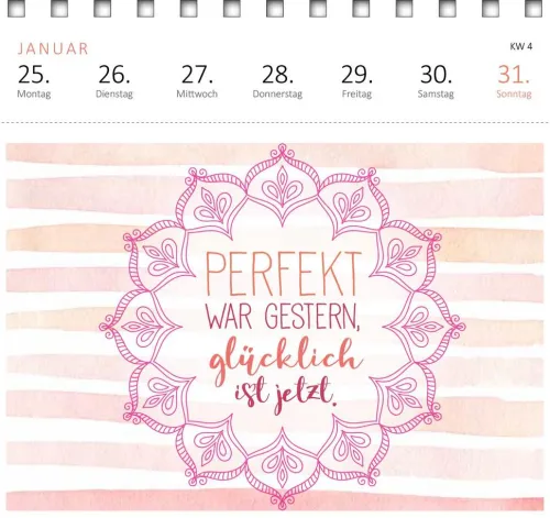 Ein tolles Geschenk für alle, die glücklicher leben möchten, Inspiration zum Glücklichsein und positive Affirmationen für ihren Alltag suchen. Der Kalender mit Postkarten ist eine Kraftquelle für die Seele – jedes Mal aufs Neue zaubert dieser Wochenkalender 2027 mit seinen schönen Sprüchen, Zitaten und Affirmationen ein Lächeln ins Gesicht. Mit dem praktischen Wochenkalendarium behält man stets den Überblick, egal ob im Büro, Homeoffice oder zu Hause. Die Postkarten mit stimmungsvollen Motiven lassen sich an der Perforation heraustrennen und können so an liebe Menschen verschickt werden.