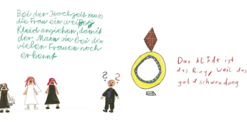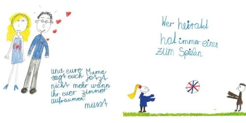 Unter der Anleitung des Grundschullehrers Jan Kuhl – der hauptberufliche Pädagoge hat bereits zahlreiche Geschenkbücher bei arsEdition veröffentlicht – ist ein schelmisch-heiteres Buch über den schönsten Tag im Leben entstanden. In „Hochzeit machen ist sooo schön“ erzählen und malen 24 Schulkinder ihre Gedanken zum Thema Heiraten und Ehe. Auch über die Tücken der Ehe wissen die Kinder Bescheid – ja, es gibt wirklich viel zu bedenken . . .