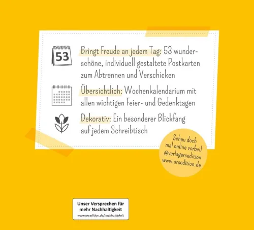 Mit dem praktischen Wochenkalendarium behält man stets den Überblick, egal ob im Büro, Homeoffice oder zu Hause. Die Postkarten mit stimmungsvollen Fotografien lassen sich an der Perforation heraustrennen und können so an liebe Menschen verschickt werden.