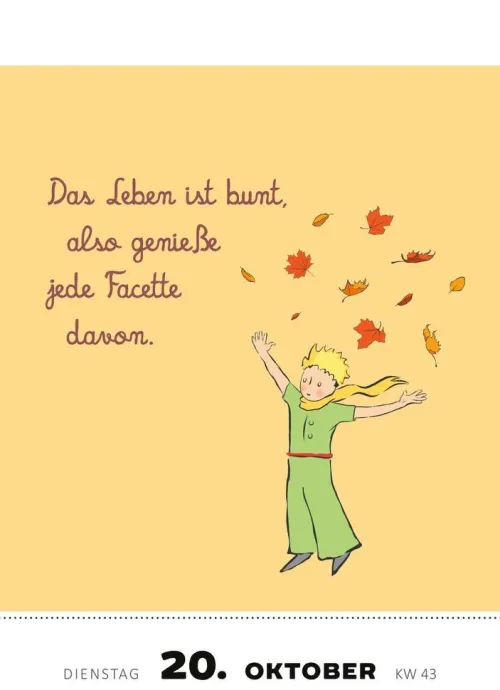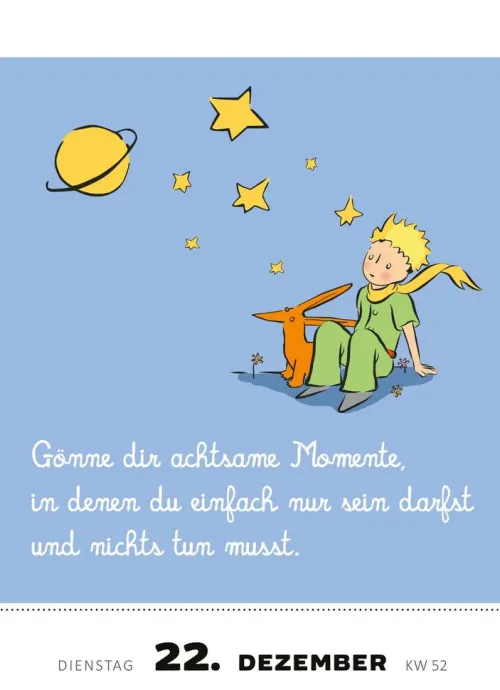 Der Kleine Prinz lädt ein zu einer inspirierenden Reise, in der jeder Tag zu einem kleinen Highlight wird. Für alle Fans des kleinen Prinzen!