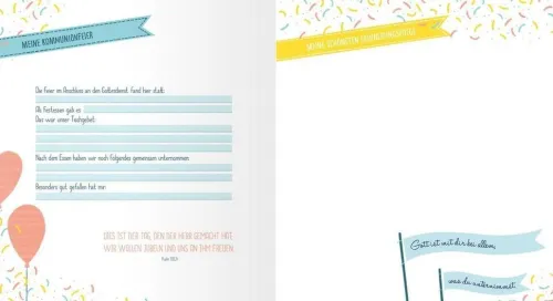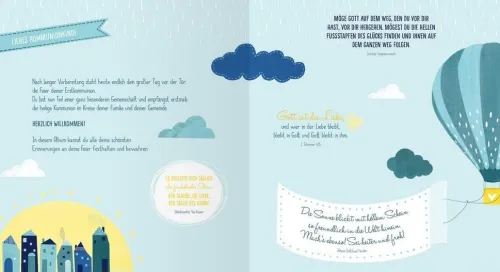 Das Kommunionkind hat in dem hochwertigen Buch die Möglichkeit, die Einladungskarte oder das Liedblatt des Gottesdienstes einzukleben, aber auch die Gäste, Eltern, Großeltern und Taufpaten finden Platz, um sich mit Wünschen zu verewigen. Segenswünsche, Bibelverse und Kindergebete begleiten den Weg hin zum Tag der Kommunion.