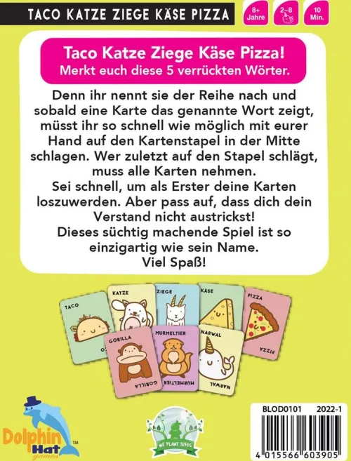 Taco Katze Ziege Käse Pizza! Klingt absurd – ist es auch! Genau das ist der Spaß an dem schnellen Partyspiel von Blue Orange. Die Spieler versuchen, sich diese fünf Begriffe und auch ihre Reihenfolge zu merken, denn sie müssen sie aufsagen, während sie ihre Karten ablegen. Passt der Begriff zur Karte, sollte schnell reagiert und zugeschlagen werden! Der letzte Spieler, der seine Hand auf den Kartenstapel in der Mitte schlägt, hat diese Runde verloren und muss alle Karten aufnehmen. Ziel ist es jedoch, alle seine Karten loszuwerden. Das verrückte Reaktionsspiel gibt es jetzt im neuen kompakten Boxformat mit praktischem Aufhänger.