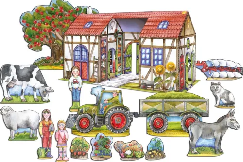 Nach dem Ausschneiden und Basteln fährt der Traktor das Heu in die Scheune zu den Schafen, Kühen, Esel und Hasen. Hühner gackern fröhlich im Hühnerstall und frisch geerntetes Gemüse verkauft eine Bäuerin im Hofladen. In der Wohnküche kocht der Eintopf auf dem Herd. Durch die stabile und offene Konstruktion lässt sich der Hof gut Bespielen auch im Innenraum und mit bereits vorhandenen Tieren ergänzen. Eine ideale Beschäftigung für daheim und unterwegs zur Förderung der Feinmotorik und Konzentration im Vor- und Grundschulalter. Gedruckt auf FSC zertifiziertem Papier in der EU, Druckfarben mit European Standard EN 71/3 für SpielzeugSeit über 30 Jahren ein Bastelspaß für die ganze Familie aus Deutschland. Kreatives Papierspielzeug – bespielbarer Bauernhof mit Traktor, Anhänger und Pflug, Schaf, Kuh, Esel, Katze, Bäuerin und Kinder, Pflanzen der Tomate, Kartoffel, Möhren und Kohl8 Seiten liebevoll und detailreich illustriert vom renommierten Designer Kurt Völtzke. Größe Tiere: ca. 10 x 10 cmGröße Stallung Illustrierte Ausgabe