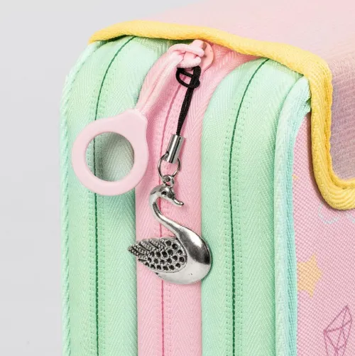 B/H/T: 200×125×75 mm, Kunstfaser, Farbe: mehrfarbig, pastell, mit Anhänger, 3 Reißverschlüsse, Inhalt: 18 dünne Markenbuntstifte, 9 dicke Markenbuntstifte, 2 Markenbleistifte, Lineal 16 cm, Metalldoppelspitzer, Radiergummi, Kinderschere, Geldfach mit Klettverschluss, innovative Stifterampe für leichteres Entnehmen, horizontales Öffnen spart Platz auf dem Schreibtisch, mit ergonomischem Zipper für müheloses Öffnen und Schließen Kunstfaser, B/H/T: 200×125×45 mm.
