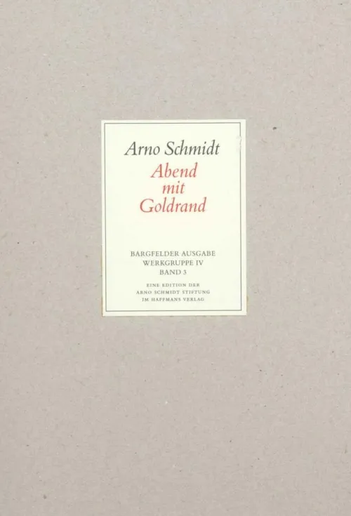 Wie Die Schule der Atheisten ist auch der 1975 veröffentlichte Abend mit Goldrand ein Dialogroman, doch entführt die MärchenPosse – so die Genrebezeichnung – mit ihren 55 Bildern den Leser nicht in eine phantastische Zukunft, sondern in die Gegenwart des fiktiven Heidenests Klappendorf im Jahr 1974. Drei alte Männer, alle-samt Abschattungen ihres Schöpfers Arno Schmidt, beherrschen die Szenerie: der Militärexperte Eugen Fohrbach, der Bibliothekar Egon Olmers und der Schriftsteller Alexander Ottokar Gläser, genannt A&O. Den drei literaturversessenen Rentiers zur Seite stehen Fohrbachs Frau Grete, beider Stieftochter Martina und die Haushälterin Asta Reichelt. Das Geschehen gerät in Bewegung mit der Ankunft einer Gruppe von Hippies, die auf dem Weg nach Tasmanien drei Tage in dem Dörfchen ihr Lager aufschlägt. Deren geisterhafte Anführerin Ann‘ Ev‘ und der intellektuelle Kopf der Truppe, »Egg«, durchkreuzen die Gespräche der drei Alten über Friedrich Hackländer, Theodor Däubler und all die andern Unbekannten der Literatur und wirbeln sämtliche Beziehungen durcheinander. Der melancholische Roman, der von Erinnerungen an Schmidts eigene trostlose Kindheit durchzogen ist, sollte das letzte Werk werden, das er vollenden konnte.