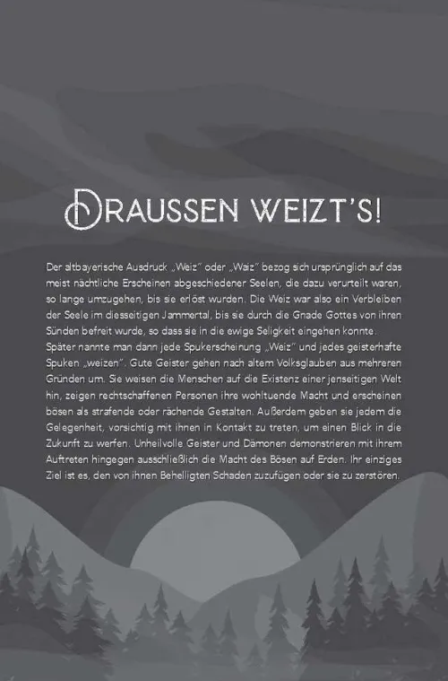 Die Weihnachtszeit in Bayern ist nicht nur eine heimelige Zeit, in der man sich um den Adventskranz schart und märchenhaften Geschichten lauscht. Die Wochen von Allerheiligen bis zum Heiligedreikönigstag waren schon immer auch eine Zeit, die vom Glauben an dunkle Wesen geprägt war. . . Die kürzer werdenden Tage, das Absterben der Natur, die sich ausbreitende Kälte und lange, stürmische Nächte regten die Fantasie der Menschen an. In den Köpfen der Leute entstanden eigenartige unheimlicheWesen; heidnische und christliche Gestalten begannen sich zu vermischen. Nebelfrauen und Schneegespenster „weizten“, trieben also ihren Spuk ebenso wie Windsbräute und Sturmdämonen. DieToten geister kehrten wieder und andere dunkle Gestalten standen auf, so der Hargeist, die Wildbärbel, die zottigen Klaubaufs, die Schiache Luz und der Bluadige Thamerl. Ebenso ängstigte man sich vor Teufeln, Hexen und Druden. Werwölfe und Haberngoaßn trieben ihr Unwesen. In der dämonischen Zwölfenzeit, wie die Nächte vom 25. Dezember bis zum 6. Januar heißen, führten Heidengötter, allen voran die Frau Percht und der Wot die „Wilde Jagd“ an. Mit den Unschuldigen Kindln und dem Zwoagsicht Janus klang das Jahr aus, das in der Dreikini-Rauhnacht nochmals einen eindrucksvollen Höhepunkt, Abschluss und gleichzeitig Neubeginn erlebte. Noch heute lassen Perchtenbünde und Rauhnachts-Gruppen die alten Bräuche, die lange Zeit vergessen schienen, wieder eindrucksvoll aufleben. Der bekannte Autor Alfons Schweiggert erweckt in seinem neuen Buch sagenhafte Gestalten und alte Bräuche der winterlichen Zeit zum Leben – in schaurig-gruseligen Geschichten . . .