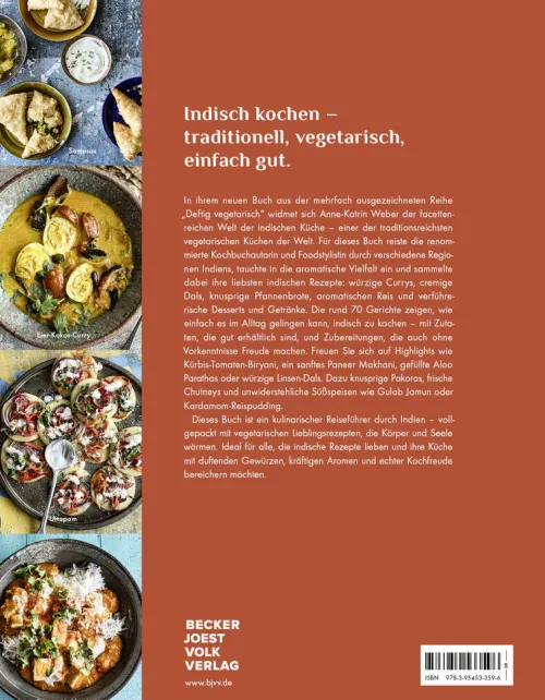 In ihrem neuen Buch aus der mehrfach ausgezeichneten Reihe Deftig vegetarisch widmet sich Anne-Katrin Weber der facettenreichen Welt der indischen Küche einer der traditionsreichsten vegetarischen Küchen der Welt. Für dieses Buch reiste die renommierte Kochbuchautorin und Foodstylistin durch verschiedene Regionen Indiens, tauchte in die aromatische Vielfalt ein und sammelte dabei ihre liebsten indischen Rezepte: würzige Currys, cremige Dals, knusprige Pfannenbrote, aromatischen Reis und verführerische Desserts und Getränke. Die rund 70 Gerichte zeigen, wie einfach es im Alltag gelingen kann, indisch zu kochen mit Zutaten, die gut erhältlich sind, und Zubereitungen, die auch ohne Vorkenntnisse Freude machen. Freuen Sie sich auf Highlights wie Kürbis-Tomaten-Biryani, ein sanftes Paneer Makhani, gefüllte Aloo Parathas oder würzige Linsen-Dals. Dazu knusprige Pakoras, frische Chutneys und unwiderstehliche Süßspeisen wie Gulab Jamun oder Kardamom-Reispudding.