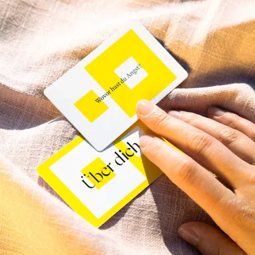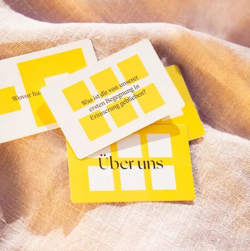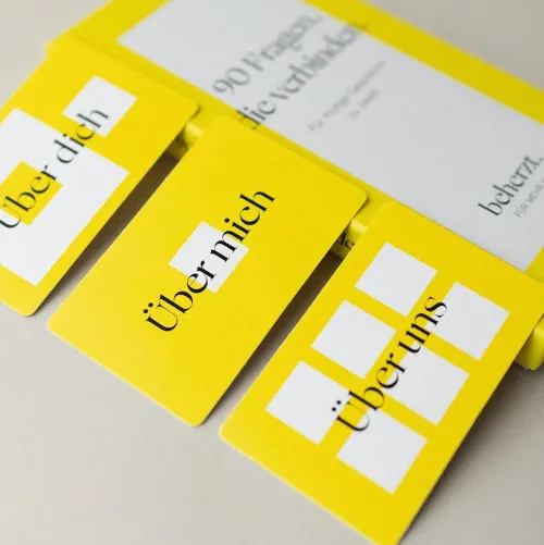 Das sind 90 stilvoll gestaltete Kommunikationskarten, die sich in die Kategorien „Über dich“, „Über mich“ und „Über uns“ unterteilen. Jede Karte enthält eine persönliche Frage, die zu einem tiefergehenden Dialog zwischen zwei Menschen anregt – seien es Partner:innen, Freund:innen oder Familienmitglieder. Drei besonders gut für den Einstieg geeignete Karten bilden den Auftakt, der Rest des Gesprächsverlaufs bleibt den Redenden selbst überlassen. Wir stellen uns zu selten die wirklich wichtigen Fragen. Weil Zeit und Mut oder ein Anlass fehlen. 90 Fragen ist dieser Anlass. Es bietet Gesprächskarten für zwei vertraute Personen- ganz gleich ob Freund:innen, Partner:innen oder Familienmitglieder, die zu Nähe bereit sind. Denn 90 Fragen öffnet Lippen und Herzen, befeuert Offenheit, festigt Annahmen, wirft andere über den Haufen, biegt Mundwinkel, lässt stutzen, rötet Wangen, gräbt tief, fordert Mut, hebt Augenbrauen und kitzelt Komplimente heraus.100 % FSC-zertifiziertes Altpapier