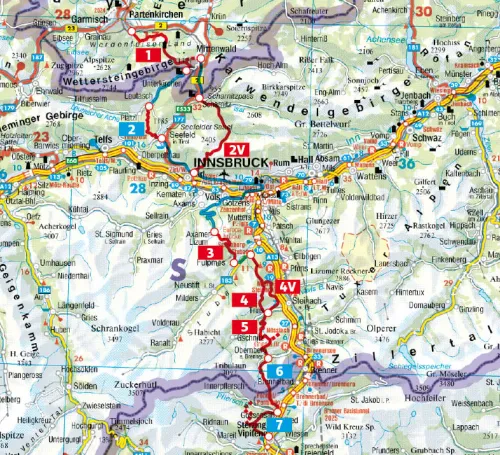 Los geht die Alpenüberquerung im berühmten Ort Garmisch-Partenkirchen am Fuße der Zugspitze. Auf hervorragend präparierten Wegen führt die Route durchs Inntal, immer mit Prachtblicken auf die gewaltigen Bergmassive von Wetterstein und Karwendel. Danach durchquert man die östlichen Stubaier Alpen und wandert über den Alpenhauptkamm. Nach sieben Etappen hat man das pittoreske Städtchen Sterzing in Südtirol erreicht.