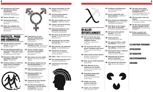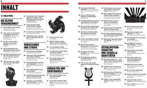 – Die Geschichte von LGBTQIA* in sechs großen Kapiteln: Die ältere Vergangenheit; Renaissance und Strafe; Subkultur und Sichtbarkeit; Sexualwissenschaften und sexuelle Identitäten; Proteste, Pride und Bündnisse; In aller Öffentlichkeit