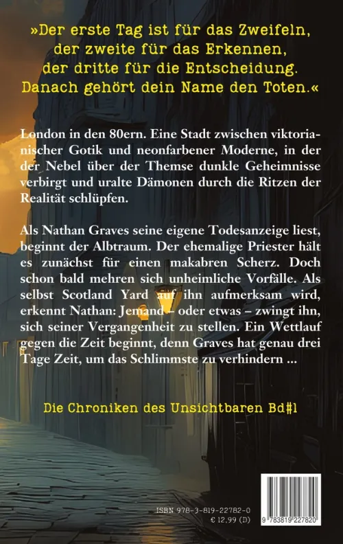 Als Nathan Graves seine eigene Todesanzeige liest, beginnt der Albtraum. Der ehemalige Priester hält es zunächst für einen makabren Scherz. Doch schon bald mehren sich unheimliche Vorfälle. Als selbst Scotland Yard auf ihn aufmerksam wird, erkennt Nathan: Jemand – oder etwas – zwingt ihn, sich seiner Vergangenheit zu stellen. Ein Wettlauf gegen die Zeit beginnt, denn Graves hat genau drei Tage Zeit, um das Schlimmste zu verhindern . . .