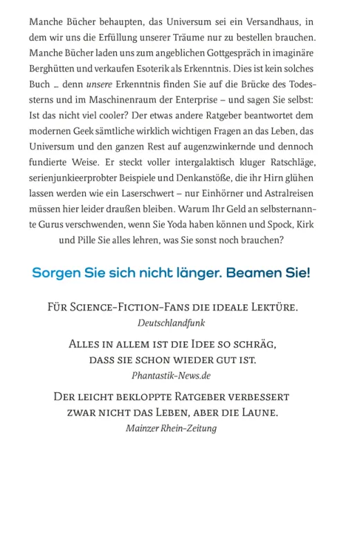 »Sorge dich nicht, beame« wurde erstmals im Jahr 2012 veröffentlicht. Das Rad der Zeit* dreht sich allerdings unerbittlich weiter; manche der Pointen oder Referenzen von damals mögen heute schon latent angestaubt wirken. Die Autoren haben sich entschieden, den Text für die vorliegende Neuauflage dennoch nicht zu verändern, denn genau nach ihm haben die Leser:innen all die Jahre verlangt – dies- und jenseits der galaktischen Barriere. . *An dieser Stelle ein herzlicher Gruß an Rand al’Thor und seine Gefährten.