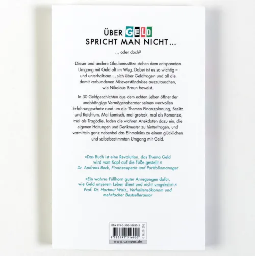 Über Geld spricht man nicht . . . oder doch? Dieser und andere Glaubenssätze stehen dem entspannten Umgang mit Geld oft im Weg. Dabei ist es so wichtig – und unterhaltsam -, sich über Geldfragen und all die damit verbundenen Missverständnisse auszutauschen, wie Nikolaus Braun beweist. In 30 Geldgeschichten aus dem echten Leben öffnet der unabhängige Vermögensberater seinen wertvollen Erfahrungsschatz rund um die Themen Finanzplanung, Besitz und Reichtum. Mal komisch, mal grotesk, mal als Romanze, mal als Tragödie, laden die wahren Anekdoten dazu ein, die eigenen Haltungen und Denkmuster zu hinterfragen, und vermitteln ganz nebenbei das Einmaleins zu einem glücklichen und selbstbestimmten Umgang mit Geld.»Das Buch ist eine Revolution, das Thema Geld wird vom Kopf auf die Füße gestellt. «Dr. Andreas Beck, Finanzexperte und Portfoliomanager»Ein wahres Füllhorn guter Anregungen dafür, wie Geld unserem Leben dient und nicht umgekehrt. «Prof. Dr. Hartmut Walz, Verhaltensökonom und mehrfacher Bestsellerautor»Wie gehen andere mit Geld um? Was beschäftigt sie, welche Gefühle leiten sie, worüber stolpern sie und wie gelingt es, finanziell zufrieden zu sein? Braun erzählt in diesem Buch Geschichten aus seiner Praxis als Honorarberater – erfrischend direkt, (selbst)reflektiert, greifbar. «Dani Parthum, Finanzcoach und Journalistin»Ein erfolgreicher Umgang mit Geld erfordert vor allem eines: Rationalität. Brauns Buch erlaubt einen tiefen Blick in unser meist irrationales Verhältnis zu Geld. Es zeigt, warum so viele Menschen beim Thema Geld scheitern, und hilft so, es selbst besser zu machen. «Dr. Gerd Kommer, Vermögensverwalter und Bestsellerautor