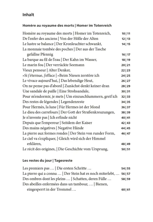 Zwischen Vision und Wirklichkeit – Gérard Macé, einer der großen lebenden Dichter Frankreichs, zum ersten Mal auf DeutschIn Gérard Macés ebenso lakonischen wie musikalischen Gedichten verwischen die Grenzen von Realität, Traum und Mythos: So erinnert ein auf dem Bürgersteig vergessener Schuh mal an Empedokles, mal an Aschenputtel; so führen uns Kindheitserinnerungen in die Welt der Märchen und Legenden, von denen allerdings nur noch Reste übrig bleiben. Und selbst der als unsterblich gefeierte Name des Odysseus erlöst nicht unsere Welt, in der nur noch die Energie der Verzweiflung neue Lebenskraft spendet: »Was von den Träumen bleibt: einstmals / verbranntes Holz, ein Haufen Asche / nach dem Aufbruch eines Nomadenlagers. / Heute Plastiktüten / zwischen den Ästen im Baum. « In Macés schillernder Lyrik entsteht so das einzigartige Gemälde einer zwischen Vision und Wirklichkeit fließenden Welt.