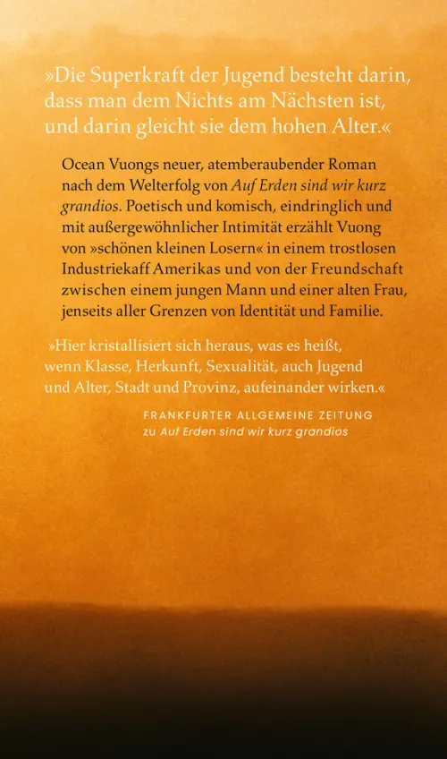 Von der Kehrseite des amerikanischen Traums: Ocean Vuongs neuer, atemberaubender Roman nach dem Welterfolg von »Auf Erden sind wir kurz grandios«Der queere Hai, Sohn einer vietnamesischen Mutter, lebt in East Gladness, einem heruntergekommenen Kaff in New England. Auf den Straßen hängen noch die Schilder der Obama-Kampagne »Yes, we can«, doch Hai schluckt Pillen und denkt an Selbstmord. Bis er Grazina aus Litauen kennenlernt, eine Überlebende des Zweiten Weltkriegs, in deren Kopf die unerlösten Geister ihres Lebens schwirren. Hai wird ihr Pfleger und fängt an, in einem Diner zu arbeiten, dessen Belegschaft alles Underdogs sind wie er, die »in dieser angeblich freien Welt aus Arbeit, Schlaf und beschissenen Kuchen gefangen sind. « Poetisch und komisch, eindringlich und mit außergewöhnlicher Intimität erzählt Ocean Vuong von der Freundschaft jenseits aller Grenzen von Identität und Familie.»’Der Kaiser der Freude‘ gibt den USA ihre schillernde Vielfalt zurück. « Deutschlandfunk