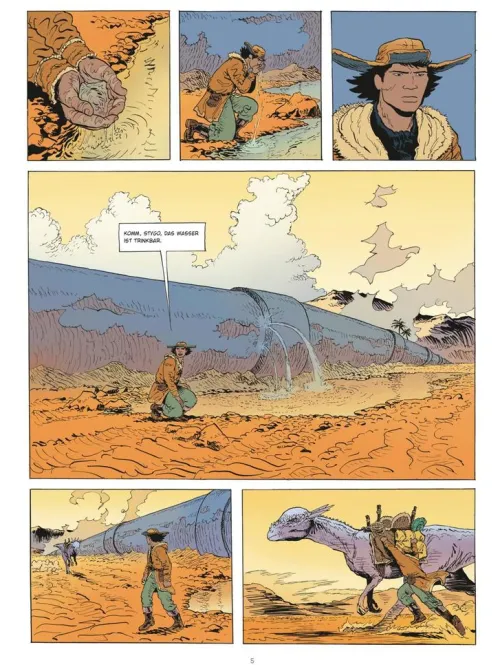 Vincent Perriot vereint im Stil Moebius‘ prähistorische Kreaturen, Science-Fiction-Urbanismus sowie Low-Tech-Schiffe. Dieser futuristische, dystopische Western präsentiert in großartig kolorierten Panels mit prächtigen Dekoren eine Geschichte über Widerstand aber auch über die Entdeckung des Selbst und des Anderen.