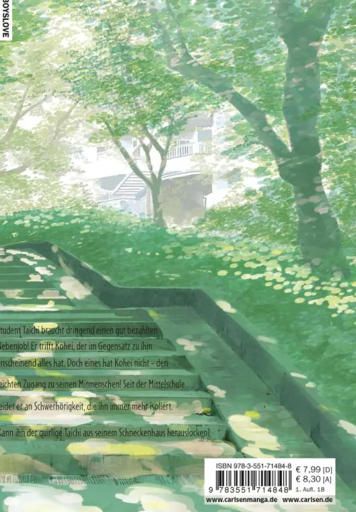 Student Taichi braucht dringend einen gut bezahlten Nebenjob! Er trifft Kohei, der im Gegensatz zu ihm anscheinend alles hat. Doch eines hat Kohei nicht – den leichten Zugang zu seinen Mitmenschen! Seit der Mittelschule leidet er an Schwerhörigkeit, die ihn immer mehr isoliert. Kann ihn der quirlige Taichi aus seinem Schneckenhaus herauslocken?