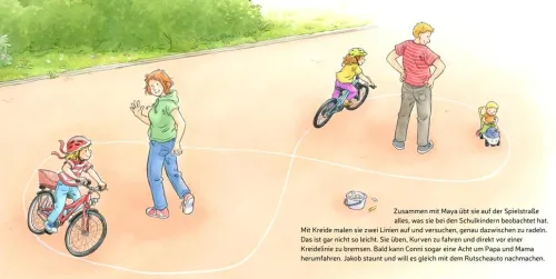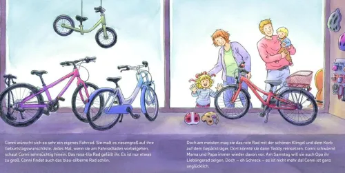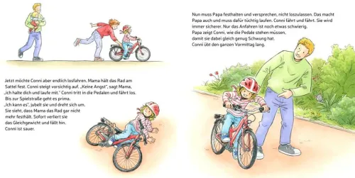 Hurra, Conni bekommt ein eigenes Fahrrad! Jetzt will sie natürlich auch unbedingt lernen, damit zu fahren. Am Anfang ist das nur gar nicht so leicht, aber mit ein bisschen Übung geht es immer besser. Schließlich kann Conni nicht nur Kurven und ordentlich bremsen, sondern auch eine richtige Acht um Mama und Papa fahren. Was für ein Spaß! Und weil es so gut klappt mit dem Radfahren, machen Mama und Papa am Sonntag eine Radtour mit Conni. Bei der muss dann nur noch Jakob in den Kindersitz, denn Conni fährt jetzt ja selbst!