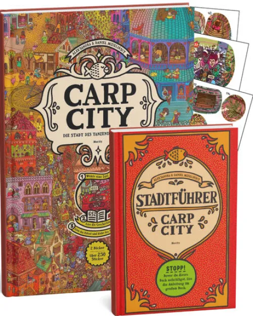Daniel Mizielinski, gemeinsam mit seiner Frau Aleksandra einer der erfolgreichsten europäischen Illustratoren und Kinderbuchmacher, überführt seine Leidenschaft, Brettspiele, in ein völlig neues Format: ein Buch, das gleichzeitig Spiel ist. Während die Leser:innen Aufgaben lösen und die Geschichte vorantreiben, verändern sie mithilfe wiederablösbarer Sticker die wimmeligen Buchseiten Stück für Stück. Carp City bereitet sich auf ein großes Fest vor, zu dem Delegationen zahlreicher Städte erwartet werden. Doch nicht alles läuft nach Plan: In einem Bezirk breitet sich eine mysteriöse Krankheit aus, ein Riese nimmt ein Bad im Hafen, magische Experimente haben rätselhafte Auswirkungen und Zombies treiben sich auf dem Friedhof herum. Nach vielen Stunden Spielspaß sind alle Rätsel gelöst und in der Stadt des Tanzenden Karpfens kann endlich gefeiert werden.