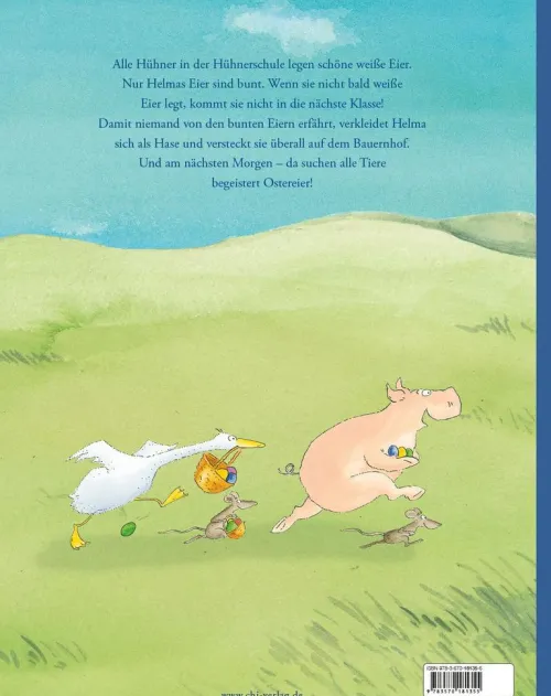 Helma ist ratlos: Als einzige Schülerin in der Hühnerschule kann sie keine weißen Eier legen. Helma produziert ein Ei nach dem anderen – alle in den leuchtendsten Farben! Wohin nun mit den vielen bunten Eiern? Schließlich darf niemand von Helmas Malheur erfahren. Da hat Helma eine geniale Idee: Sie wird sich verkleiden und die Eier auf dem Bauernhof verstecken! Am nächsten Morgen, dem Ostersonntag, wundern sich die Tiere über die schönen Eier, die sie überall finden. Nur Kuh Mona hat genau gesehen, wer die Eier verteilt hat: Es war der Hase!