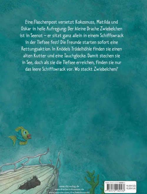 Eine Flaschenpost versetzt Kokosnuss, Matilda und Oskar in helle Aufregung: Der kleine Drache Zwiebelchen ist in Seenot – er sitzt ganz allein in einem Schiffswrack in der Tiefsee fest! Die Freunde starten sofort eine Rettungsaktion. In Knödels Trödelhöhle finden sie einen alten Kutter und eine Tauchglocke. Damit stechen sie in See, doch als sie die Tiefsee erreichen, finden sie nur das leere Schiffswrack vor. Wo steckt Zwiebelchen?