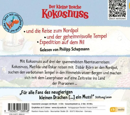 Zu diesem Anlass nimmt er seine Hörer mit auf gleich drei der spannendsten Abenteuerreisen: Kokosnuss, Matilda und Oskar begleiten den auf der Dracheninsel gestrandeten Eisbär Björn zurück nach Hause an den Nordpol. Die drei Freunde machen sich auf den weiten Weg zum verbotenen Tempel in den Himmelskratzer-Bergen, um den prophezeiten Weltuntergang aufzuhalten. Und sie wollen herausfinden, wie es den alten Ägyptern gelungen ist, die riesigen Pyramiden zu bauen. Dafür nutzen sie den Laserphaser für eine Zeitreise ins Land der Pharaonen . . .