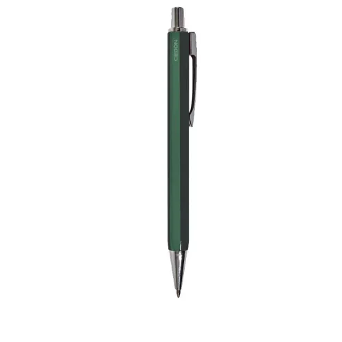 Sechseckiger Druckkugelschreiber mit lackiertem Aluminiumgehäuse, Spitze und Clip sind verchromt, die Schreibfarbe ist schwarz und die Standard Großraummine kann ausgewechselt werden. Material: Aluminium. Farbe: grün