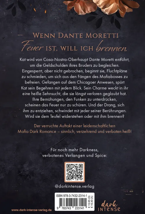 Kat wird von Cosa-Nostra-Oberhaupt Dante Moretti entführt, um die Geldschulden ihres Bruders zu begleichen. Eingesperrt, doch nicht gebrochen, beginnt sie, Fluchtpläne zu schmieden, um sich aus den Fängen des Mafiabosses zu befreien. Doch gefangen auf dem Chicagoer Anwesen, spürt Kat sein Begehren mit jedem Blick. Sein Charme weckt in ihr eine heiße Sehnsucht, die sie längst verloren geglaubt hat. Ihre Bemühungen, den Funken zu unterdrücken, scheinen das Feuer nur zu schüren. Und der Drang, ihm zu widerstehen, schwindet mit jeder seiner Berührungen. Wird sie dem Teufel widerstehen oder mit ihm brennen?