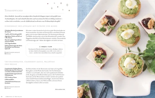 – 50 Lieblingsrezepte der Royals: Vom zitronigen Weihnachtsbaumgebäck über pikante Kleinigkeiten wie Truthahn-Sandwiches und Mini-Frittatas bis hin zum traditionellen „Christmas Pudding“.