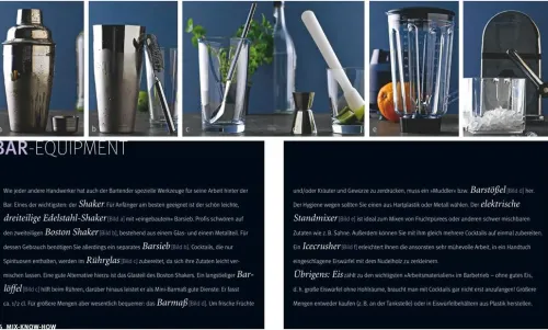 Auf drei Doppelseiten kurz und knapp alles über das nötige Bar-Equipment, die pas-senden Gläser und die Kunst des Shakens