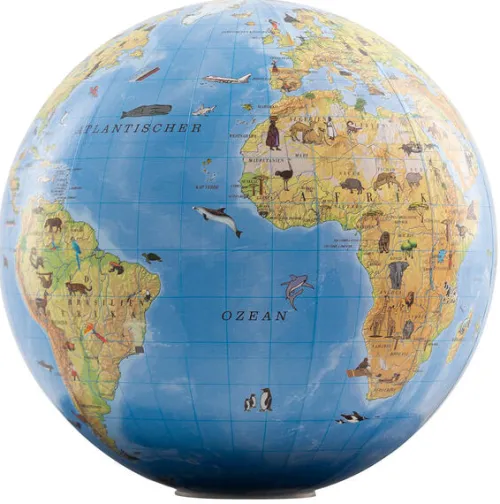 Die Spardose zeigt das kindlich ansprechende Kartenbild „Unsere Erde“, das mit farbenfrohen Tierabbildungen und einer Vielzahl an landestypischen Grafiken einen kleinen Einblick rund um unsere Welt vermittelt.