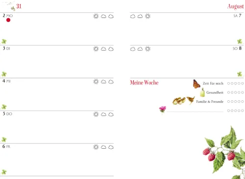 - Kalendarium mit Sternzeichen, Mondphasen, Feiertagen und viel Platz für Notizen und Termine
