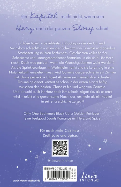 Chase Lovett – beliebtester Eishockeyspieler der Uni und Sunnyboy schlechthin – ist ewiger Schwarm von Cammie Lovelock und absolute Starbesetzung in ihren Fanfictions. Geschichten voller heißer Sehnsüchte und unausgesprochener Fantasien, in die sie all ihr Herz steckt, wenn sie nicht gerade zu beschäftigt ist, in ihren Tagträumen zu versinken. Doch was passiert, wenn die Wunschgedanken wahr werden? Als die Sprinkleranlage ihr Wohnheim tränkt und sie kurzfristig in eine Notunterkunft umziehen muss, wird Cammie ausgerechnet in ein Zimmer mit Chase gesteckt – Chase! Als wäre sie in einem ihrer kühnsten Träume gelandet, knistert es schon in der ersten Nacht heftig zwischen den beiden. Chase ist hin und weg von Cammie. Und obwohl auch ihr Herz nach ihm schreit, zögert sie, als es ernst wird – reicht eine gemeinsame Nacht aus, um mehr als ein Kapitel in seiner Geschichte zu sein?