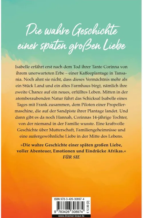 Isabelle erfährt erst nach dem Tod ihrer Tante Corinna von ihrem unerwarteten Erbe – einer Kaffeeplantage in Tansania. Noch ahnt sie nicht, dass dieses Vermächtnis mehr als ein Stück Land und ein altes Farmhaus birgt, nämlich ihre zweite Chance auf ein neues, erfülltes Leben. Mitten in der atemberaubenden Natur führt das Schicksal Isabelle eines Tages mit Frank zusammen, dem Piloten einer Propellermaschine, die auf der Sandpiste ihrer Plantage landet. Und dann gibt es da noch Hannah, Corinnas 14-jährige Tochter, von der niemand in der Familie wusste.