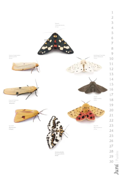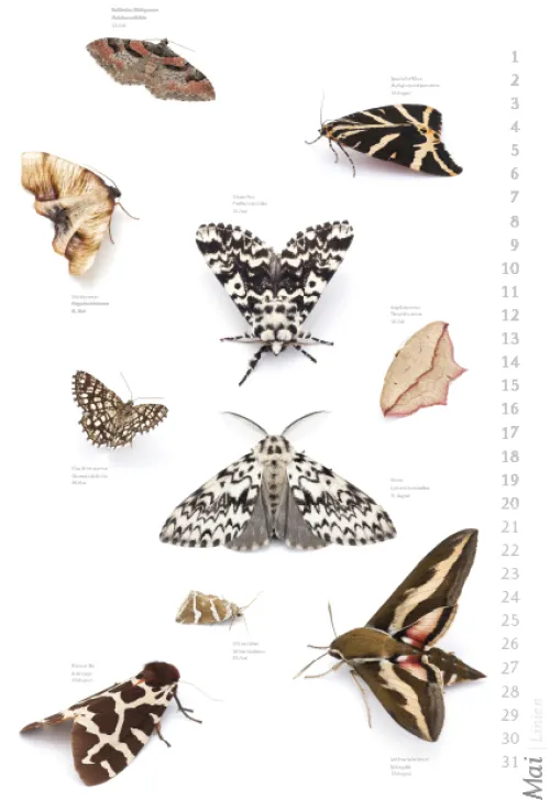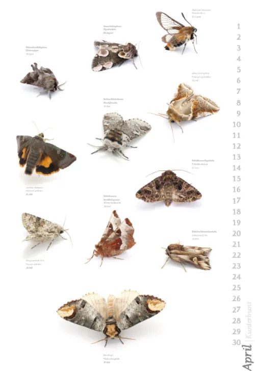 Der Autor und Fotograf Armin Dett hat während eines Beobachtungszeitraums von drei Jahren die Artenvielfallt der Nachfalter am Bodensee dokumentiert. Der Kalender zeigt einen Teil der „Nachtvögel“ mit Namen und Flugzeiten.