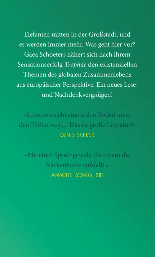 Nach »Trophäe« der neue Roman von Gaea Schoeters – über die unausweichlichen globalen Fragen aus europäischer PerspektiveElefanten mitten in der Großstadt, und es werden immer mehr. Was geht hier vor? Rasch muss der Bundeskanzler erkennen, dass die Tiere nicht aus dem Zoo entkommen, sondern ein Geschenk des Präsidenten von Botswana sind. 20 000 Elefanten hat er nach Deutschland geschickt, nachdem die deutsche Regierung ein Einfuhrverbot von Jagdtrophäen beschlossen und damit den armen Regionen Botswanas die Lebensgrundlage entzogen hat. »Ihr Europäer wollt uns vorschreiben, wie wir zu leben haben. Vielleicht solltet ihr es einmal selbst versuchen . . . «Gaea Schoeters nähert sich nach ihrem Sensationserfolg »Trophäe« den existenziellen Themen des globalen Zusammenlebens aus einer anderen Richtung – und mit blitzgescheitem Humor. Ein neues Lese- und Nachdenkvergnügen! Nominiert für das Lieblingsbuch der Unabhängigen 2025 (Shortlist)