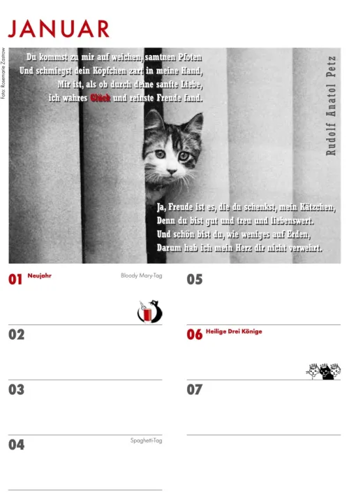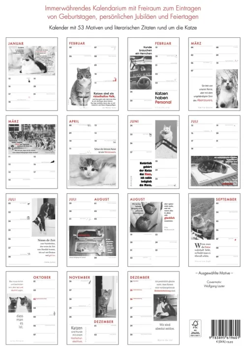 Der immerwa hrende Geburtstagskalender erscheint auf vielfachen Wunsch und ist der ideale jahresunabha ngige Begleiter des großen Katzenkalenders. Das Kalendarium bietet ausreichend Freiraum zum Notieren von Geburtstagen aller Familienmitglieder und Freunde. So mu ssen sie nicht von einem Jahr aufs na chste U bertragen werden.