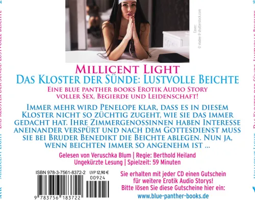 Immer mehr wird Penelope klar, dass es in diesem Kloster nicht so züchtig zugeht, wie sie das immer gedacht hat. Ihre Zimmergenossinnen haben Interesse aneinander verspürt und nach dem Gottesdienst muss sie bei Bruder Benedikt die Beichte ablegen. Nun ja, wenn beichten immer so angenehm ist . . . Gelesen von Veruschka BlumRegie: Berthold HeilandUngekürzte LesungSpielzeit: 59 MinutenDiese Ausgabe ist vollständig, unzensiert und enthält keine gekürzten erotischen Szenen.