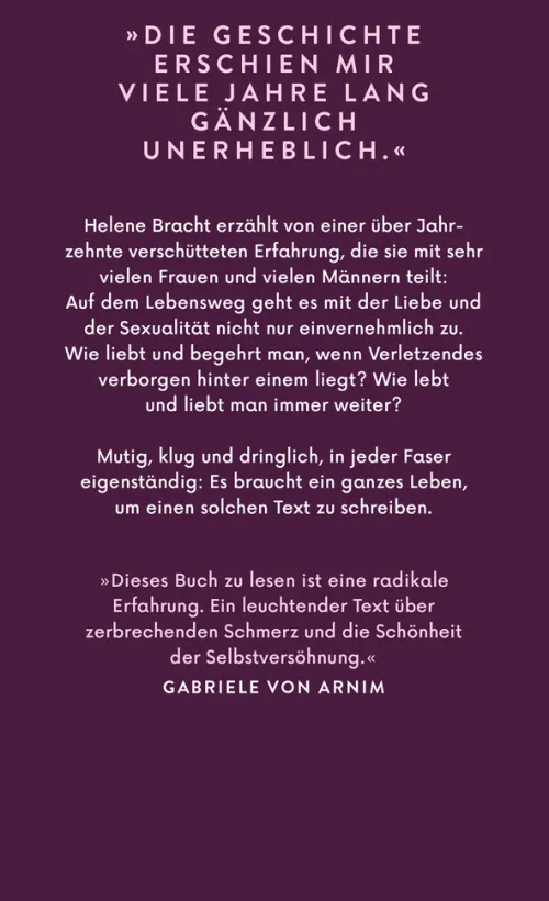 „Dieses Buch zu lesen ist eine radikale Erfahrung. Ein leuchtender Text über zerbrechenden Schmerz und die Schönheit der Selbstversöhnung“, so Gabriele von Arnim. Dieses Buch bricht die SchamWas für eine Entdeckung – es braucht ein ganzes Leben, um einen solchen Text zu schreiben. „Die Geschichte erschien mir viele Jahre lang gänzlich unerheblich.“ Von diesem Satz aus erzählt die heute siebzigjährige Helene Bracht von einer über Jahrzehnte verschütteten Erfahrung, die sie mit sehr vielen Frauen und vielen Männern teilt: der, dass es auf dem Lebensweg mit der Liebe und der Sexualität nicht nur gut und einvernehmlich zuging. Wie liebt und begehrt man, wenn Verletzendes verborgen hinter einem liegt? Wie lebt und liebt man immer weiter? Fulminant ein Tabu brechend und dabei einzigartig gewitzt und souverän erzählt dieser Text vom Missbrauch – und seinen Grenzen. Diese Bilanz wird Denkweisen verändern und vielen Menschen viel bedeuten.